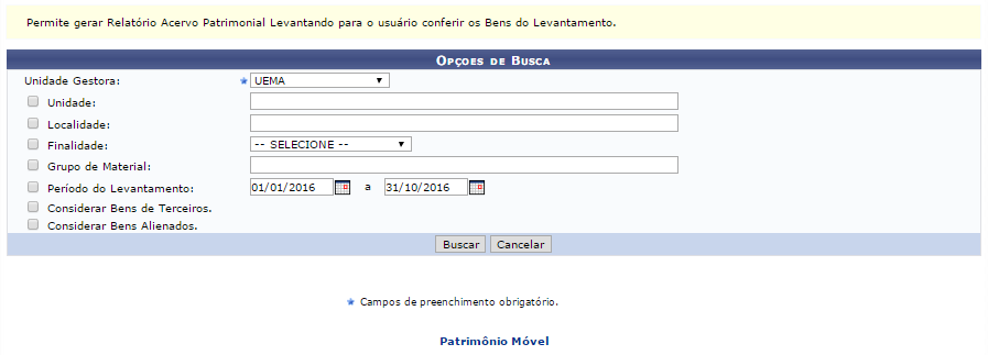 Para tanto, entre no SIGUEMA Administrativo → Módulos → Patrimônio Móvel → Levantamento Patrimonial → Relatórios → Acervo Patrimonial Levantado.