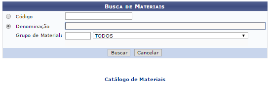 A seguinte tela será exibida pelo sistema, com o campo de Busca de Materiais: