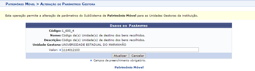 Para isso, acesse o SIGUEMA Administrativo → Módulos → Patrimônio Móvel → Cadastros → Parâmetros Gestora → Atualizar Parâmetros.