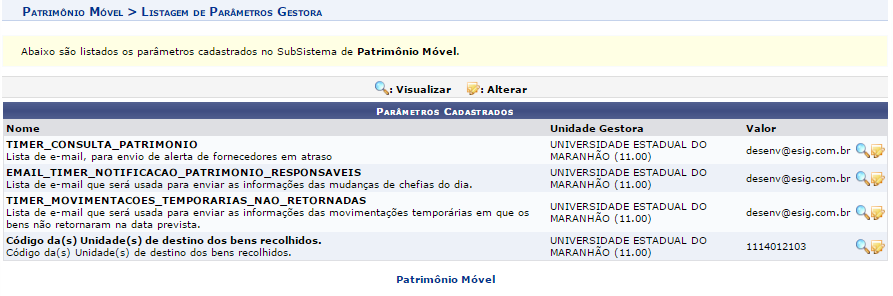 Será apresentada a tela com a listagem dos Parâmetros Cadastrados no módulo Patrimônio, da seguinte forma: