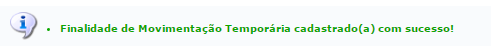 Na tela acima, o usuário deverá informar a Denominação da finalidade de movimentação temporária que deseja cadastrar. Exemplificaremos esta ação com a finalidade denominada APRESENTAÇÃO DE SEMINÁRIO. Feito isso, clique em Cadastrar. A seguinte mensagem de sucesso será carregada: