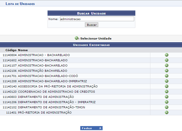 Informe o Nome da unidade desejada e clique em Buscar, as Unidades Encontradas serão exibidas: