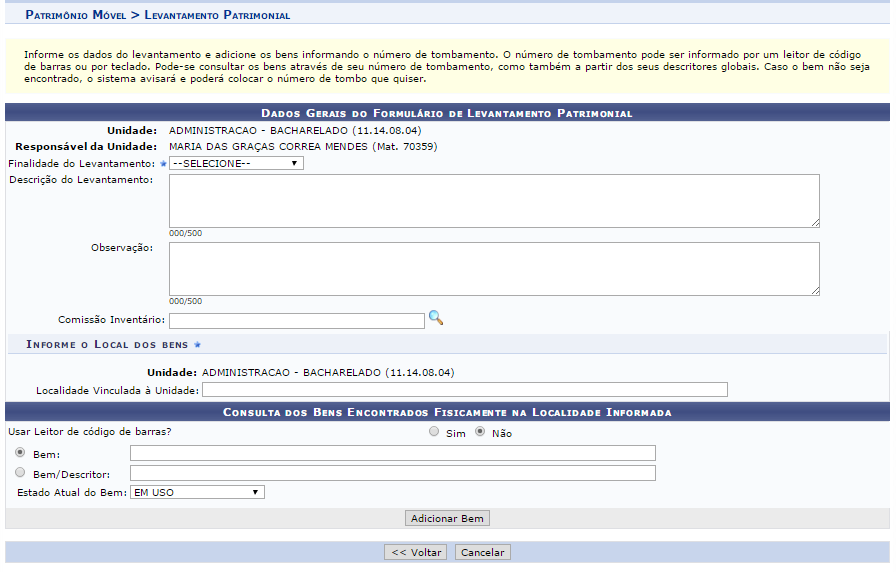 Cadastrar Levantamento tem como objetivo atualizar a base de dados no sistema com informações sobre a situação atual e condições físicas e de uso de bens duráveis da Instituição.