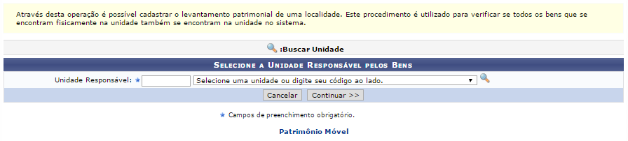 Será exibida a página Selecione a Unidade Responsável pelos Bens, onde deve ser inserido o código da Unidade desejada, a qual deverá possuir um Responsável cadastrado no sistema. Ao inserir o código, será carregado o nome da unidade automaticamente.