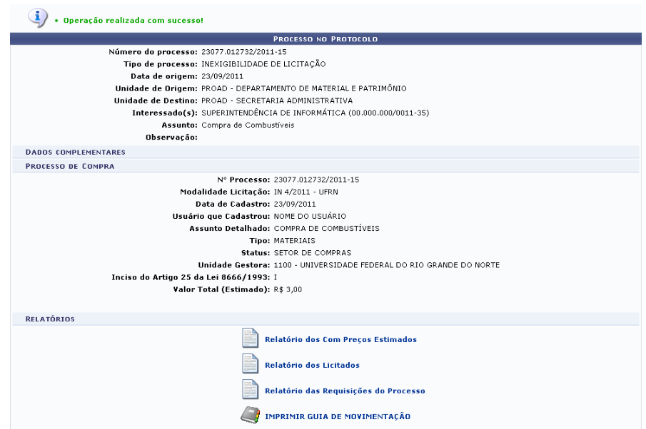Para inserir os itens ao processo, clique em Inserir Itens. A seguinte tela será exibida pelo sistema, com uma mensagem de sucesso no topo: