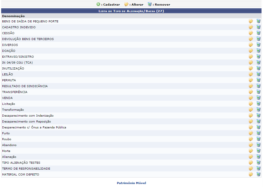 Na tela acima, o sistema lista todos os tipos de alienação/baixa cadastrados no banco de dados. Clique no ícone