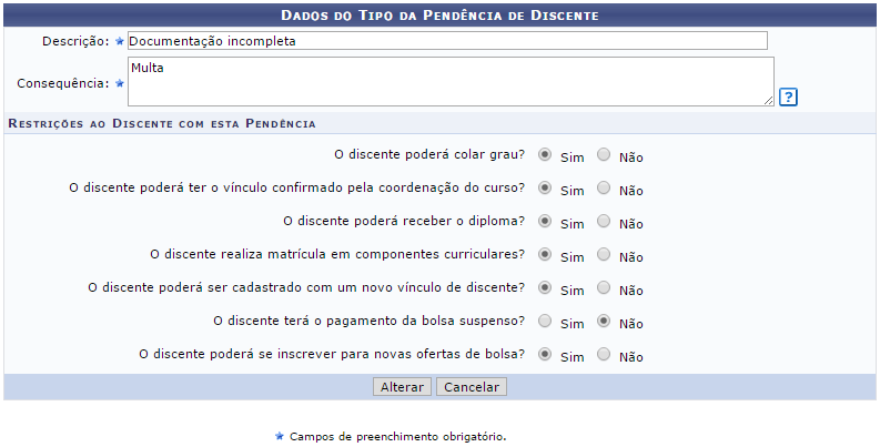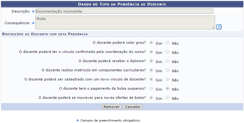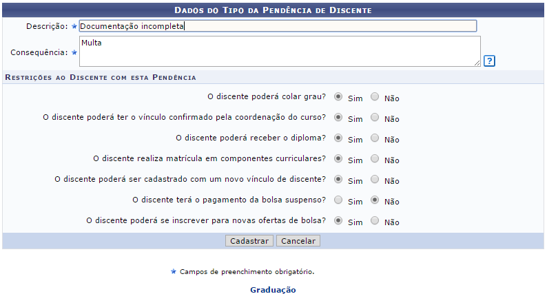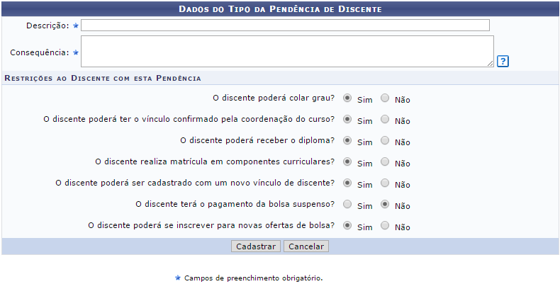 Esta funcionalidade permite ao usuário realizar o cadastro de tipos de pendências de um determinado discente da Instituição no sistema.