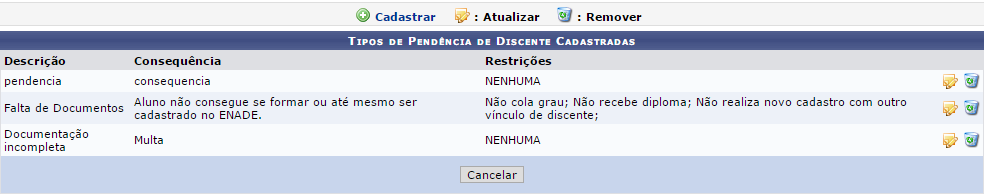 Na tela seguinte serão exibidas todos os tipos de pendências de discentes que foram cadastradas no sistema. Caso queira cadastrar um novo tipo de pendência, clique no link