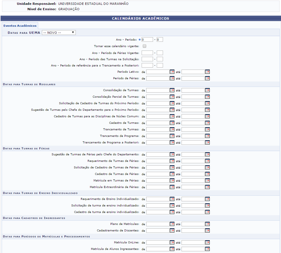 Para realizar esta operação, acesse o SIGUEMA Acadêmico → Módulos → Graduação → Administração → Operações Administrativas → Calendário Universitário.