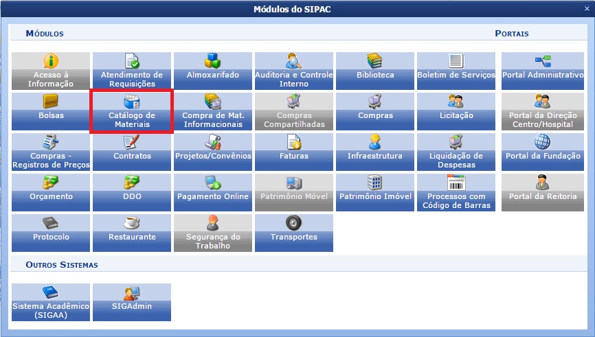 O Portal Administrativo é a interface padrão de todos os usuários no SIPAC. É a partir dele que o servidor, com as permissões necessárias, tem acesso as operações de cadastrar material, consultar material, listar minhas solicitações de cadastro, solicitar atualização de preço de material, solicitar cadastro de material, ativar materiais e autorizar cadastramento de material. O Portal fornece funções de vários módulos, caso deseje mais informações recorra a página do módulo em específico.
