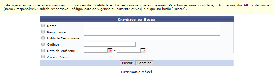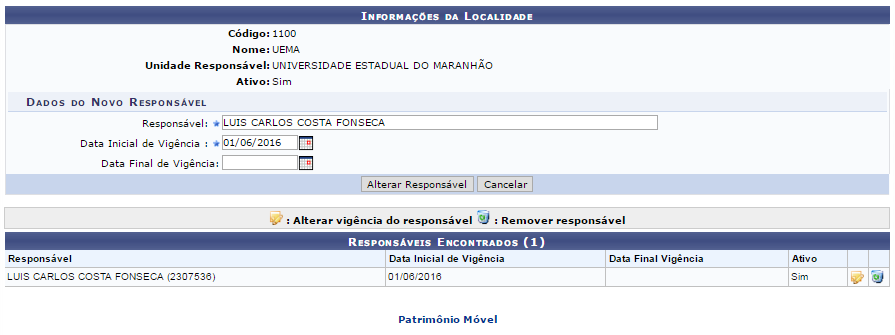 Através desta tela, é possível o usuário alterar a localidade, bem como o responsável da localidade. Exemplificaremos ambas as ações separadamente.