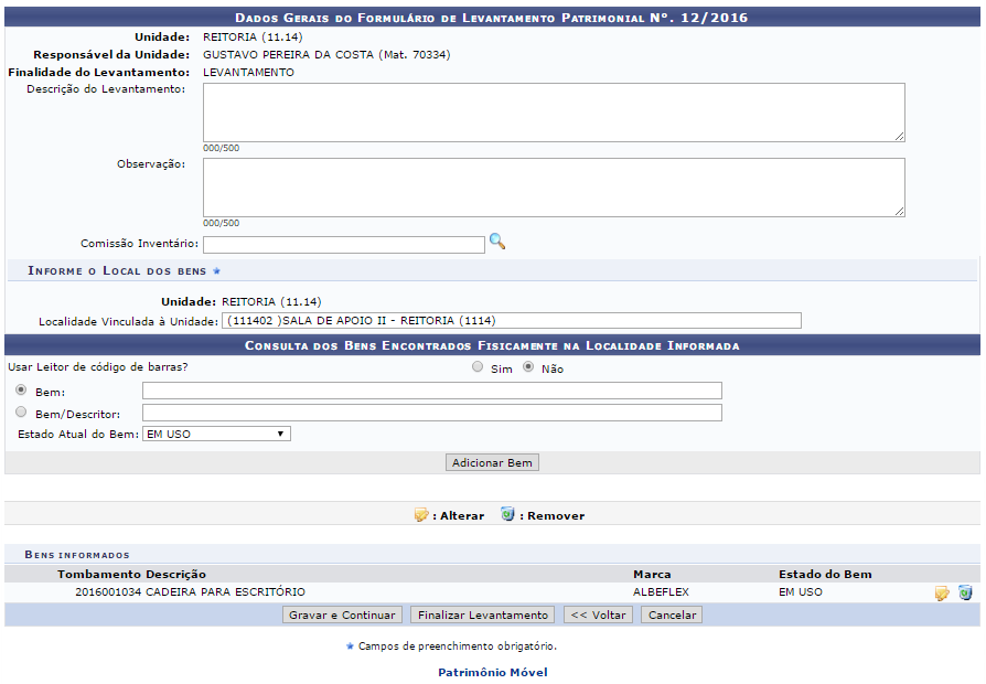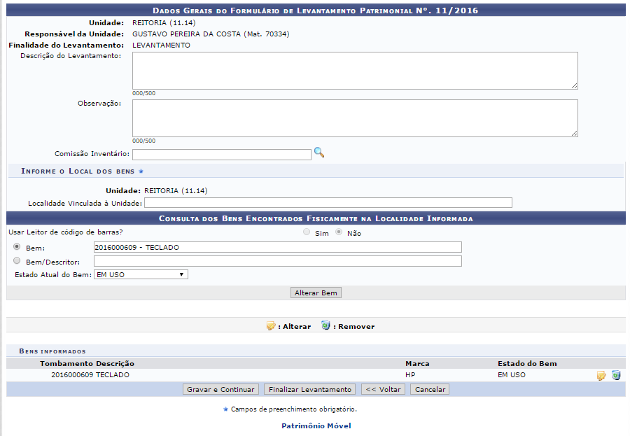 é possível alterar dados dos bens do levantamento da unidade selecionada.
