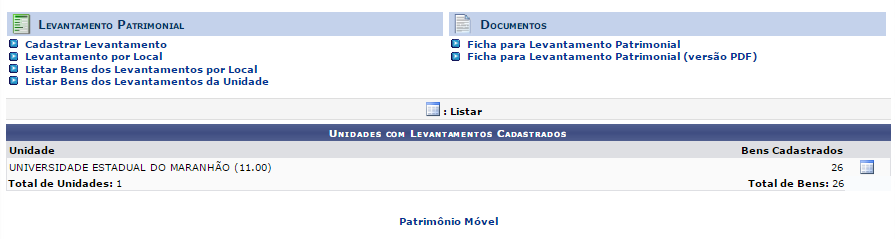 As operações presentes na tela Unidades com Levantamentos Cadastrados serão explicadas em Menu Levantamento Patrimonial listado em Manuais Relacionados.
