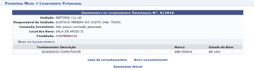 Clique no ícone para visualizar o levantamento e será exibida a tela com o Comprovante do Levantamento Patrimonial.