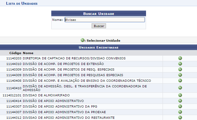 Informe o Nome da unidade desejada e clique em Buscar, as Unidades Encontradas serão exibidas: