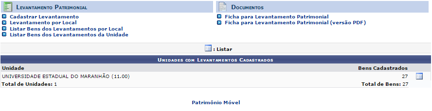 Analise as Unidades existentes e selecione a desejada para verificar a situação do levantamento patrimonial clicando em .