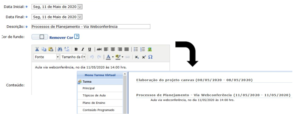 O docente poderá fazer o agendamento da aula via webconferência através da criação de um tópico de aula, em que na descrição poderá ser informado o horário e mais informações sobre aquela aula. O tópico poderá ser cadastrado através do seguinte passo: SIGUEMA → Portal do Docente → Ambientes Virtuais → Turmas Virtuais → Turmas Virtuais abertas → Componente Curricular → Turma → Conteúdo Programado